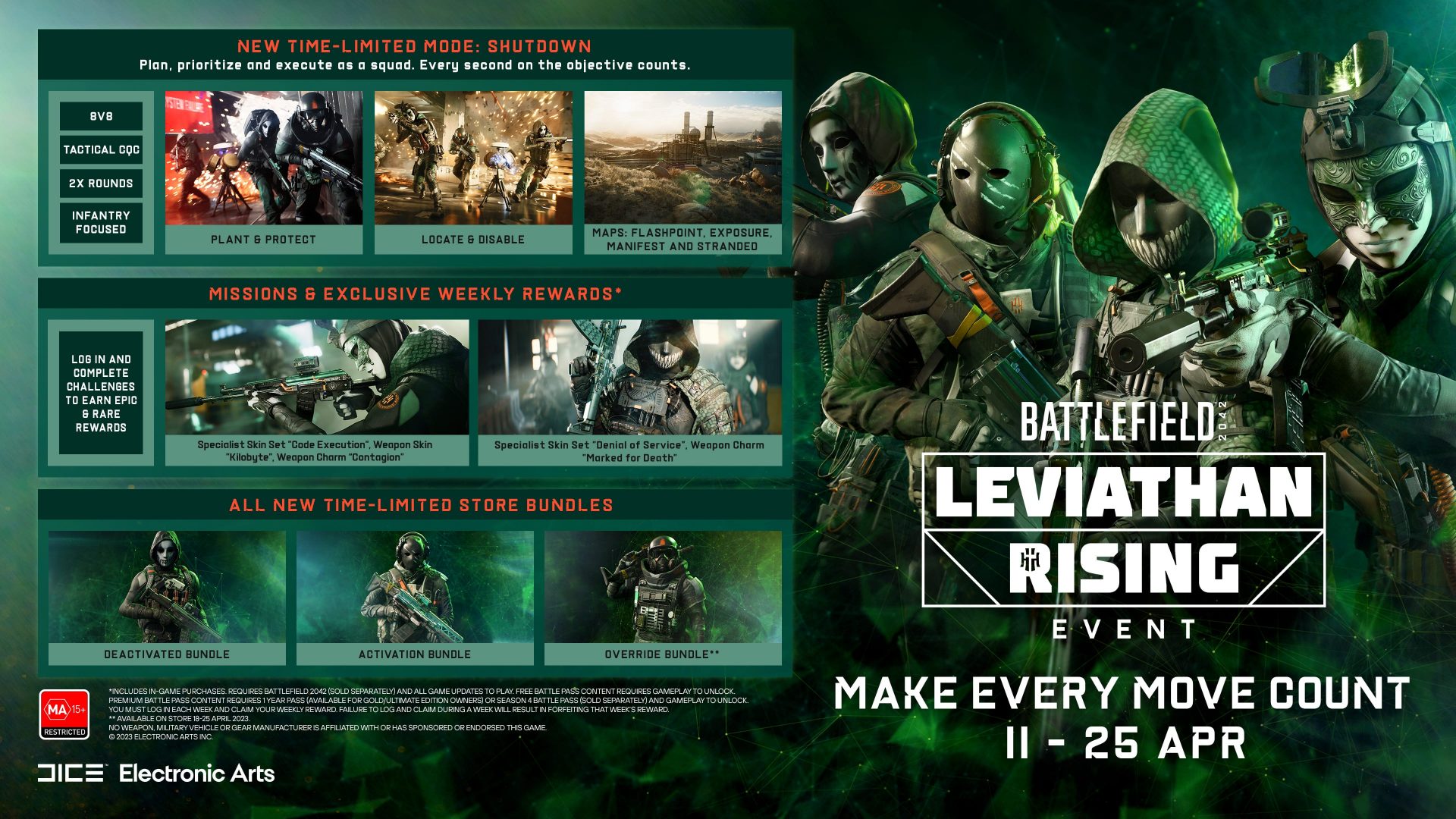 Das Event „Leviathans Aufstieg” läuft vom 11. bis 25. April um 14:00 Uhr und beinhaltet den neuen 8-gegen-8-Modus „Shutdown” mit zwei Runden für 16 Spieler, in dem Angreifer und Verteidiger nach 10 – 15 Minuten die Plätze tauschen. Der Modus wird auf den kleineren Infanterie-Layouts der Karten Flashpoint, Kontakt, Manifest und Gestrandet gespielt.
