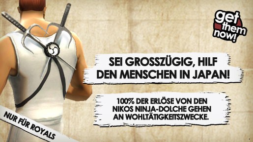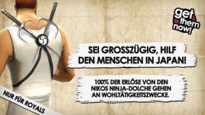 Battlefield Heroes will mit deiner Unterstützung den Menschen in Japan helfen. Mit der Aktion “Wohltätigkeitsbündel” bietet der eigene Store zwei Pakete an. Das eine Paket beinhaltet Nikos Ninja-Dolche und das andere ein Ninja-Schwert. Beide können ab sofort gekauft werden. Der Erlös geht an die hilflosen Menschen nach Japan, die gleich drei folgeschweren Katastrophen ausgeliefert sind.