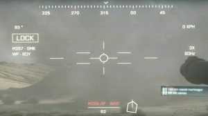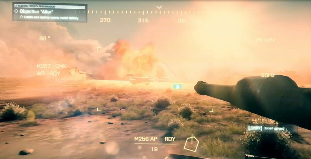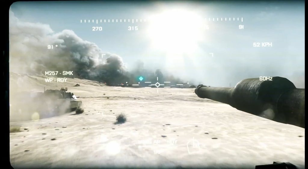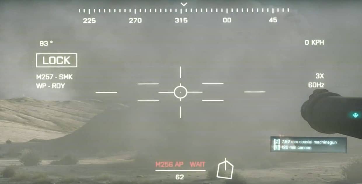 Bei der abenteuerlichen Panzerfahrt durch die Wüste sind einige Details aufgefallen. Zunächst erscheint auf der linke Seite des Panzer HUD´s der Schriftzug “M257 – SMK”, welches ein Hinweise auf einen Nebelvorhang ist, in dem sich der Panzer verstecken und zurückziehen kann. Ebenfalls fallen die Schriftzüge auf, auf den “WP RDY” steht, die sowohl beim Hauptgeschütz als auch beim Nebelzusatz zu sehen sind. WP RDY steht für die Einsatzbereitschaft des jeweiligen Waffe. Unter der Anzeige für das Hauptgeschütz gibt es eine Anzeige für die Entfernung von anvisierten Zielen.