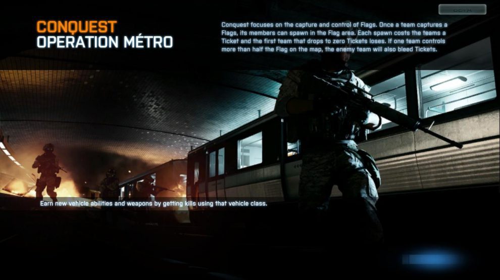 Operation Métro besteht auch im Conquestmodus aus den bereits bekannten Elementen (Métro Station, Lobby und Außenbereich). Im Gegensatz zur Rushversion der Karte wurde bei der Conquest Version auf den ersten Teil der Karte verzichtet.
