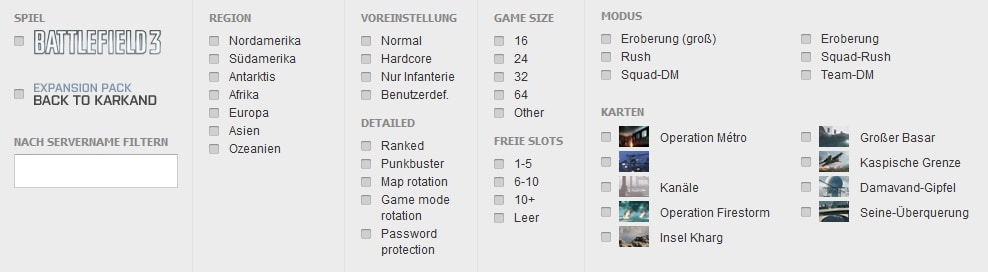 Heute hat der Serverbrowser im Battlelog ein Update erhalten. Wie nicht schwer zu erkennen ist, sind die Filtereinstellungen neu struturiert und mit weiteren Funktionen versehen worden. So hat man nun unter anderem die Möglichkeit nach einer gewünschten Gesamtslotanzahl auf einem Server zu suchen.