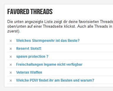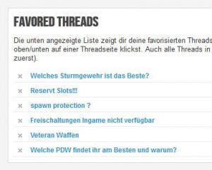 Spieler, die das Forum ausgiebig nutzen, vermissen die eine oder andere Funktion. Beispilesweise weiss man nicht so wirklich welche Threads man beobachtet oder in welchen man bereits diskutiert hat. Better Battlelog liefert eine Funktion, mit der ihr eine Favoritenliste erstellen könnt. So behältst du immer einen Überblick über die für dich wichtigen Themen. |