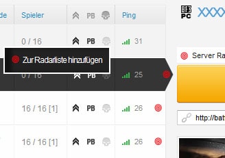 Mit dem Better Battlelog kannst du von dir gewählte Server durch ein Symbol auf die gleiche Weise wie beim User Radar markieren. Von diesem Moment an wirst du immer gewarnt, wenn diesem Server beitreten möchtest. Das Radar ist nur für dich persönlich und beinhaltet nur Server, die du selbst markiert hast. |