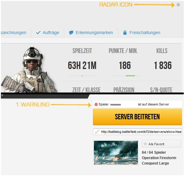 Mit dem Better Battlelog kannst du von dir gewählte Spieler durch ein Symbol im Profil eines jeden Spielers markieren. Von diesem Moment an wirst du bei jedem Verbinden auf einem Server gewarnt, wenn sich einer der markierten Spieler auf diesem Server befindet. Damit verhinderst du Begegnungen mit Spielern, die du meiden möchtest. Das Radar ist nur für dich persönlich und beinhaltet nur Spieler, die du selbst markiert hast. |
