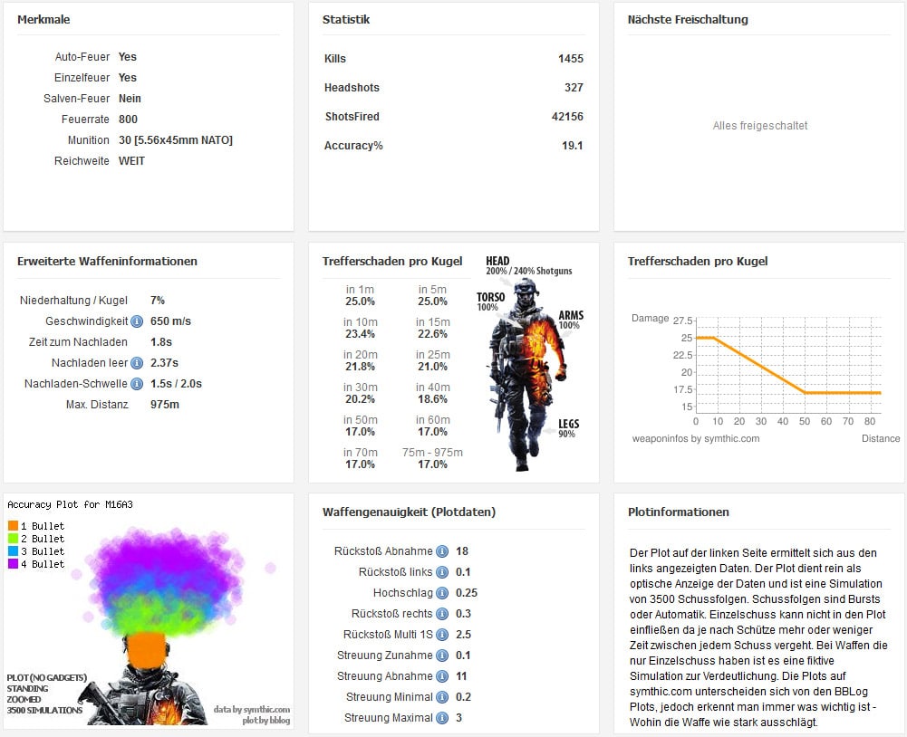 Battlelog selbst liefert nur die nötigsten Waffeninformationen. Mit Better Battlelog wurde in Zusammenarbeit mit symthic.com eine Möglichkeit geschaffen sehr viele zusätzliche Waffeninformationen zu liefern. Charts und Accurany Plots runden das Profil ab. |