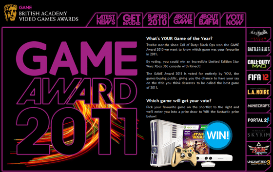 Die British Academy Video Game Awards gehen in die nächste Runde und Battlefield 3 braucht deine Stimme, um sich gegen Konkurrenten wie Call of Duty Moden Warfare 3, Minecraft, Skyrim und Co. durchzusetzen. Hier gelangst du zum Voting.