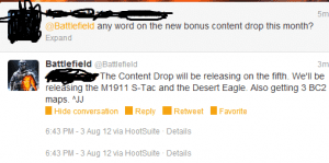 Einem Gerücht zu Folge sollte es am gestrigen Sonntag neue Karten sowie neue Waffen für Battlefield 3 Spieler geben. Als Beleg für dieses Gerücht soll ein Screenshot eines Spielers gelten, der auf dem offiziellen Battlefield Twitter Channel angefragt hat, ob es für diesen Monat noch neue Inhalte für Battlefield 3 geben wird. Als Antwort bekam der Spieler, dessen Name unkenntlich gemacht wurde, die Antwort, dass es drei neue Karten geben wird, welche aus Battlefield Bad Company 2 bekannt sind sowie zwei neue Waffen. (M1911 S-Tac & Desert Eagle)