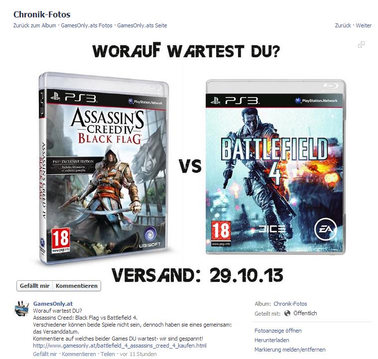 Der in Österreich ansässige Spielehändler Gamesonly.at hat heute via Facebook bekannt gegeben, dass Battlefield 4 am 29. Oktober 2013 im eigenen Lager eintrifft und noch am gleichen Tag an die Vorbesteller verschickt wird. Eine solche Meldung weckt natürlich auch direkt wieder allerhand Spekulationen auf dem Plan, die sich mit dem tatsächlichen Releasedatum des neuen Shooters beschäftigen.