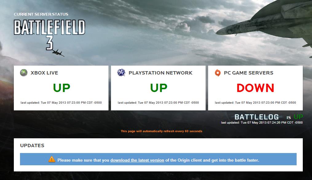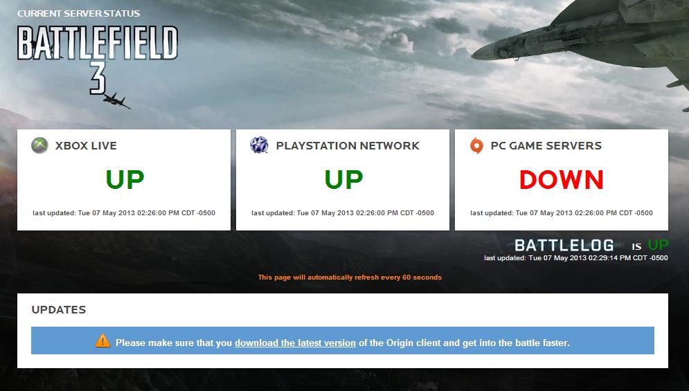 Update #4 08. Mai 2013 – 02:37 Uhr: Die Battlefield 3 Origin Masterserver sind aktuell wieder erreichbar.