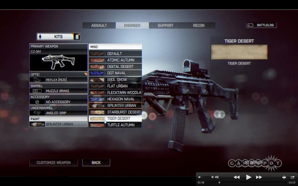 Battlefield 4 bietet viele Möglichkeiten seinen eigenen Soldaten und die getragene Waffe anzupassen.Dazu hat jede Waffe vier Gadget Slots, an die beispielweise ein schwerer Lauf oder ein Frontgriff montiert werden kann. Dazu wird jede Waffe des weiteren diverse Tarnungen haben.