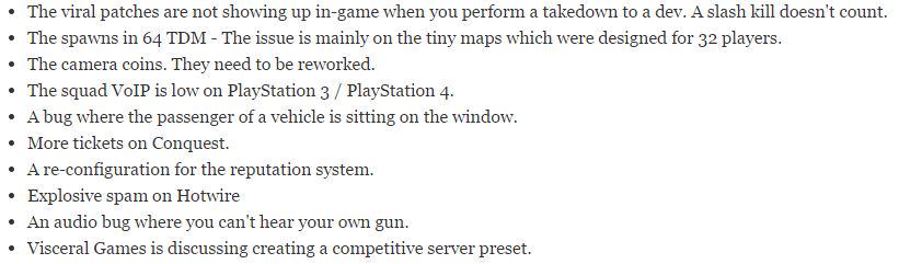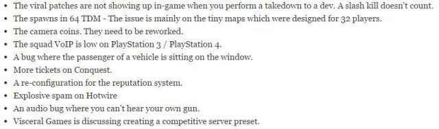 Visceral Games wird nämlich das Gespamme von Explosivwaffen im Hotwire Spiemodus entschärfen, die Spawnpunkte im Team Deathmatch Spielmodus überarbeiten und die viralen Abzeichen, die man von Entwicklern durch einen Takedown-Kill mit dem Messer oder der Schlagwaffe erbeuten kann, endlich auch gutschreiben, damit man die viralen Abzeichen auch ausrüsten kann. Des Weiteren will man im Conquest Spielmodus mehr Tickets einstellen und ein Preset extra für den eSport erstellen.