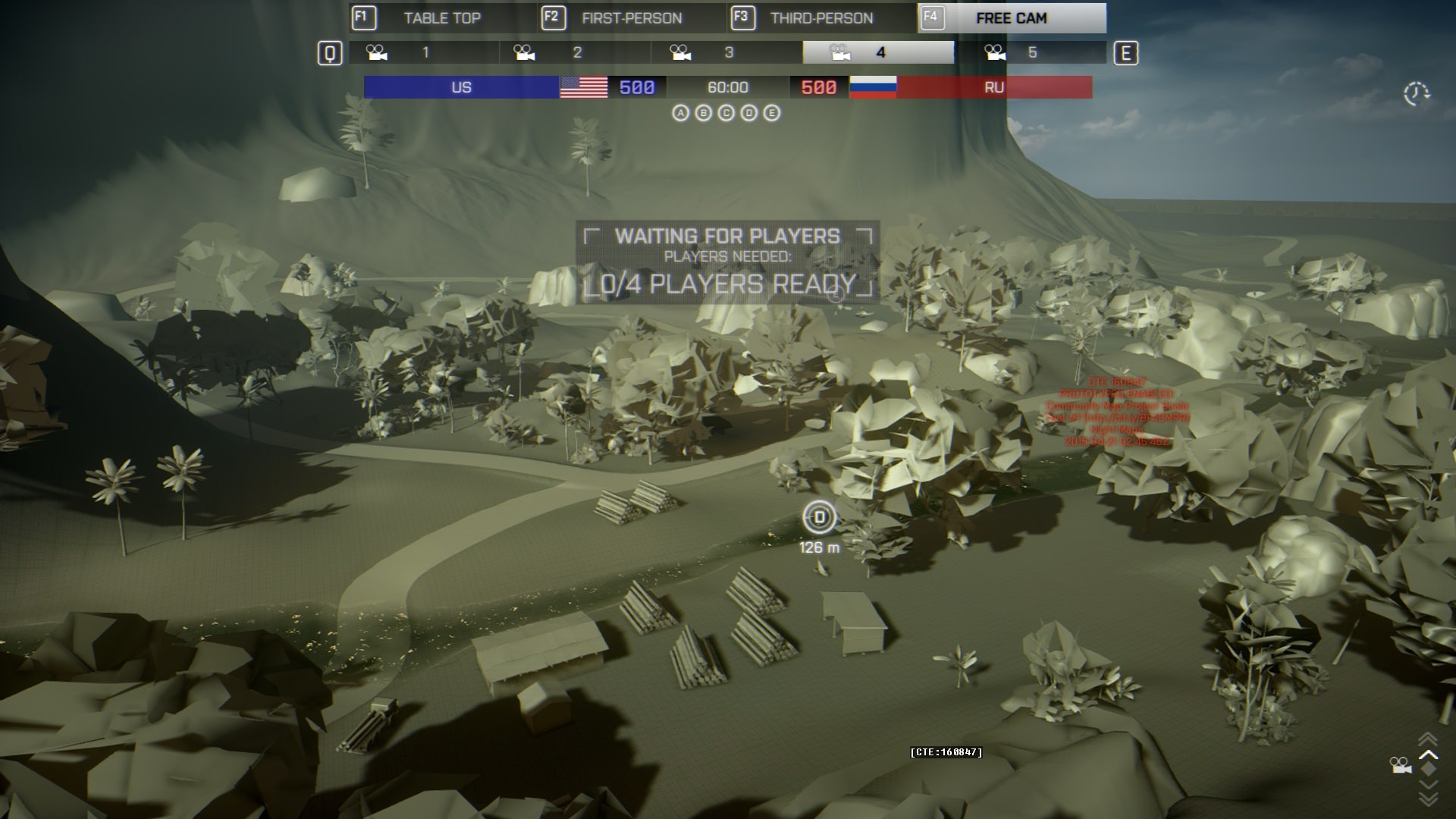 Das ist aber auch nich weiter schlimm, denn in einem Scale Test sollt ihr nicht die tolle Landschaft bewundern, sondern Distanzen, Höhenlinien und problematische Map-Bereiche. Sichtlinien, Zerstörung, Fahrzeuge, Details und Co. sind in dieser Phase nicht relevant und werden in der nächsten Phasen überarbeitet.