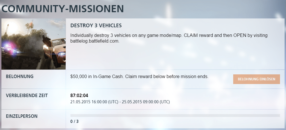 Seit heute gibt es eine neue Community Mission für Battlefield Hardline, bei der ihr mit 50.000$ In-Game Geld belohnt werdet. Um die Belohnung zu bekommen, müsst ihr in dieser Community Mission drei Fahrzeuge möglichst individuell zerstören. Welchen Spielmodus oder welche Map ihr spielt, spielt für die Community Mission keine Rolle.