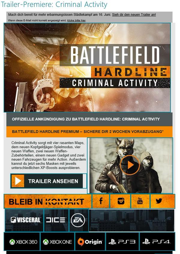 Es gibt Gerüchte, die besagen, dass Battlefield Hardline: Criminal Activity, also der erste DLC für Battlefield Hardline früher erscheint als bisher angenommen. Criminal Activity erweitert Hardline um die vier neuen Mehrspieler-Karten Backwoods, Code Blue, The Beat und Black Friday. Zwei der Maps spielen bei Nacht. Zu den weiteren Neuerungen zählen drei Waffen, zwei Fahrzeuge und zwei Munitionstypen, ein Gadget und sechs neue Masken. Ebenfalls neu ist das Nailgun-Kampf, die als Battlepickup aufgenommen werden kann als auch der Kopfgeldjäger-Spielmodus.
