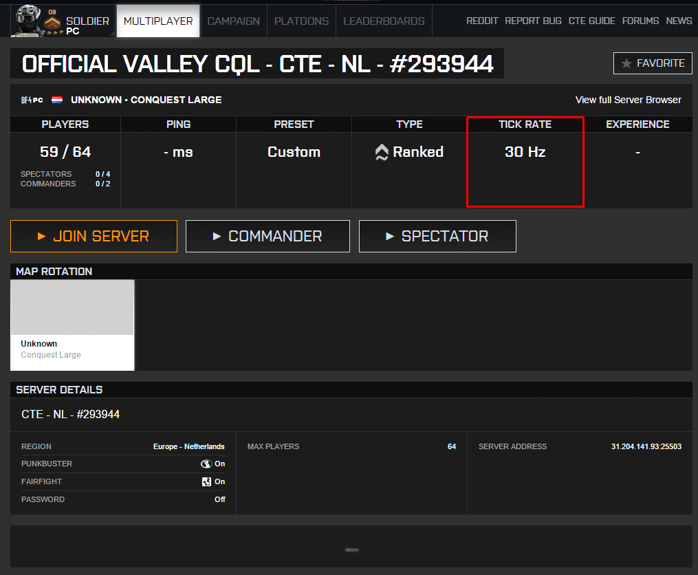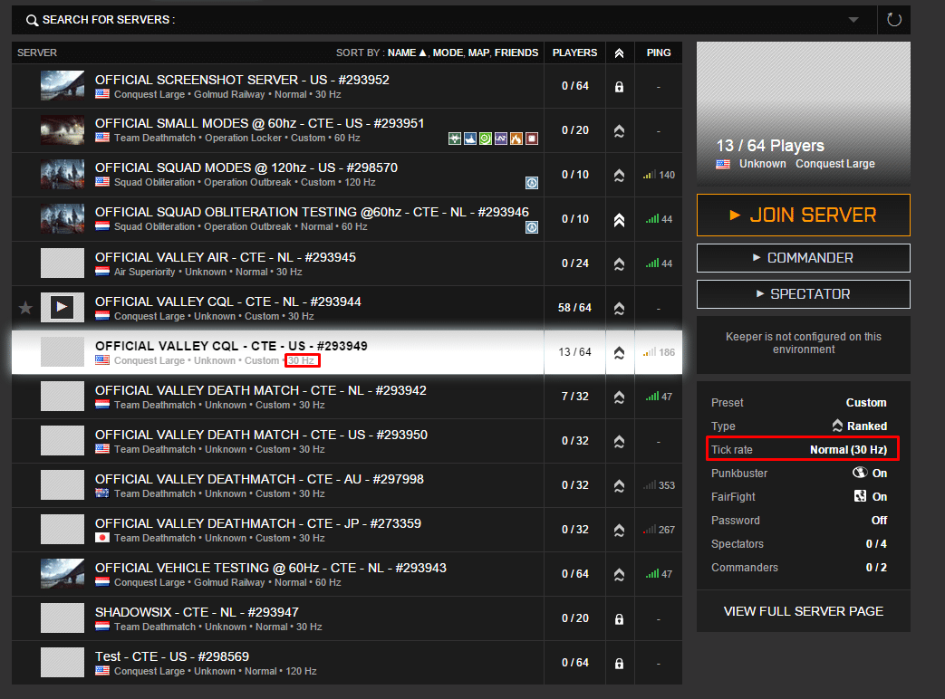 Mit dem Herbstpatch ist damit aber endgültig schluss. DICE hat nun im Battlelog des Community Test Environments diverse Anzeige- und Filter-Einstellungen hinzugefügt. Ab dem nächsten Dienstag kann man daher gezielt nach Gameservern mit einer maximalen Tickrate von 30Hz, 45Hz, 60Hz, 120Hz oder eben 144Hz suchen.