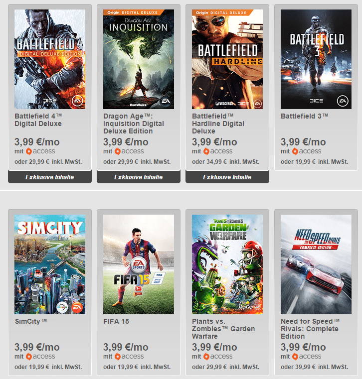 Unter diesen Spielen befindet sich die Battlefield 4 Digital Deluxe Version, Battlefield Hardline in der Digital Deluxe Version, Battlefield 3, Dragon Age Inquisition, Sim City, FIFA 15, Plants vs. Zombies Garden Warfare und die Complete Edition von Need for Speed Rivals. Alle Spiele können für monatlich 3,99€ heruntergeladen und endlos gespielt werden, sofern ihr das Origin Access Abo nicht kündigt. Mit der Zeit sollen immer weitere Spiele hinzukommen.