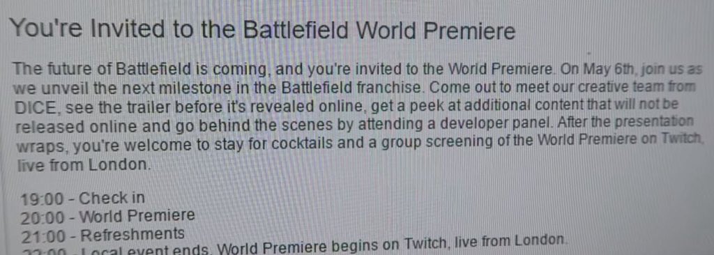 Den morgen bestimmte ein Bild die Schlagzeilen. Bei diesem Bild handelte es sich um den Kopf einer speziellen Einladung zur Battlefield Weltpremiere in Berlin und London, die am 06. Mai 2016 stattfindet. Inzwischen hat auch jemand den Teil unter der Einladung veröffentlicht und entsprechend den Ablauf des Events und was davon nach außen kommuniziert wird veröffentlicht.