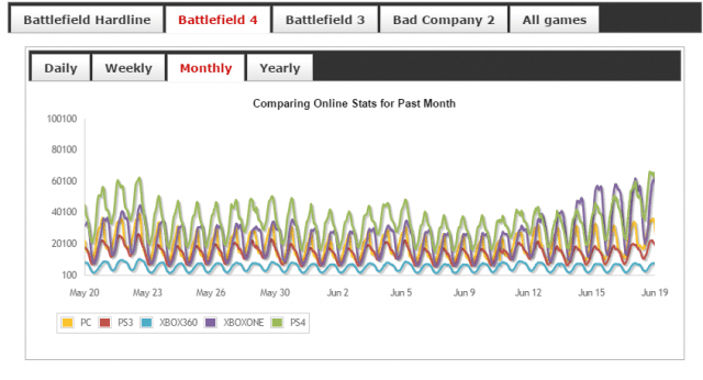 Im unteren Bereich bleibz aber trotzdem die alte Konsolengeneration und der PC. Aber auch hier ist eine leichte Tendenz nach oben sichtbar. Das Gleiche gilt auch für Battlefield 4. Auch hier steigen die Spielerzahlen auf den Next-Gen Konsolen deutlich nach oben. Auf dem PC und der alten Konsolengeneration steigen diese aber ebenso wenig wie auch bei Battlefield Hardline.