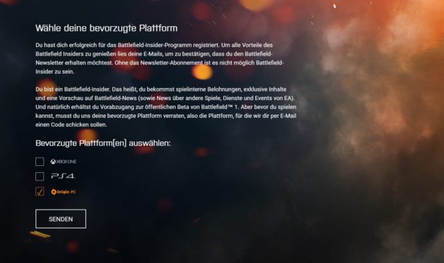 Da sich die Webseite geändert hat, sollten aber auch bereits angemeldete Battlefield-Insider die Webseite besuchen und die Plattform auswählen, auf der sie die Battlefield 1 Beta spielen wollen. Solltet ihr dies gemacht haben, werdet ihr drei Tage vor dem offiziellen Start der Battlefield 1 Beta einen entsprechenden Code für Origin, eure Xbox One oder Playstation 4 erhalten, mit dem ihr dann direkt anfangen könnt die Beta herunterzuladen und zu spielen.