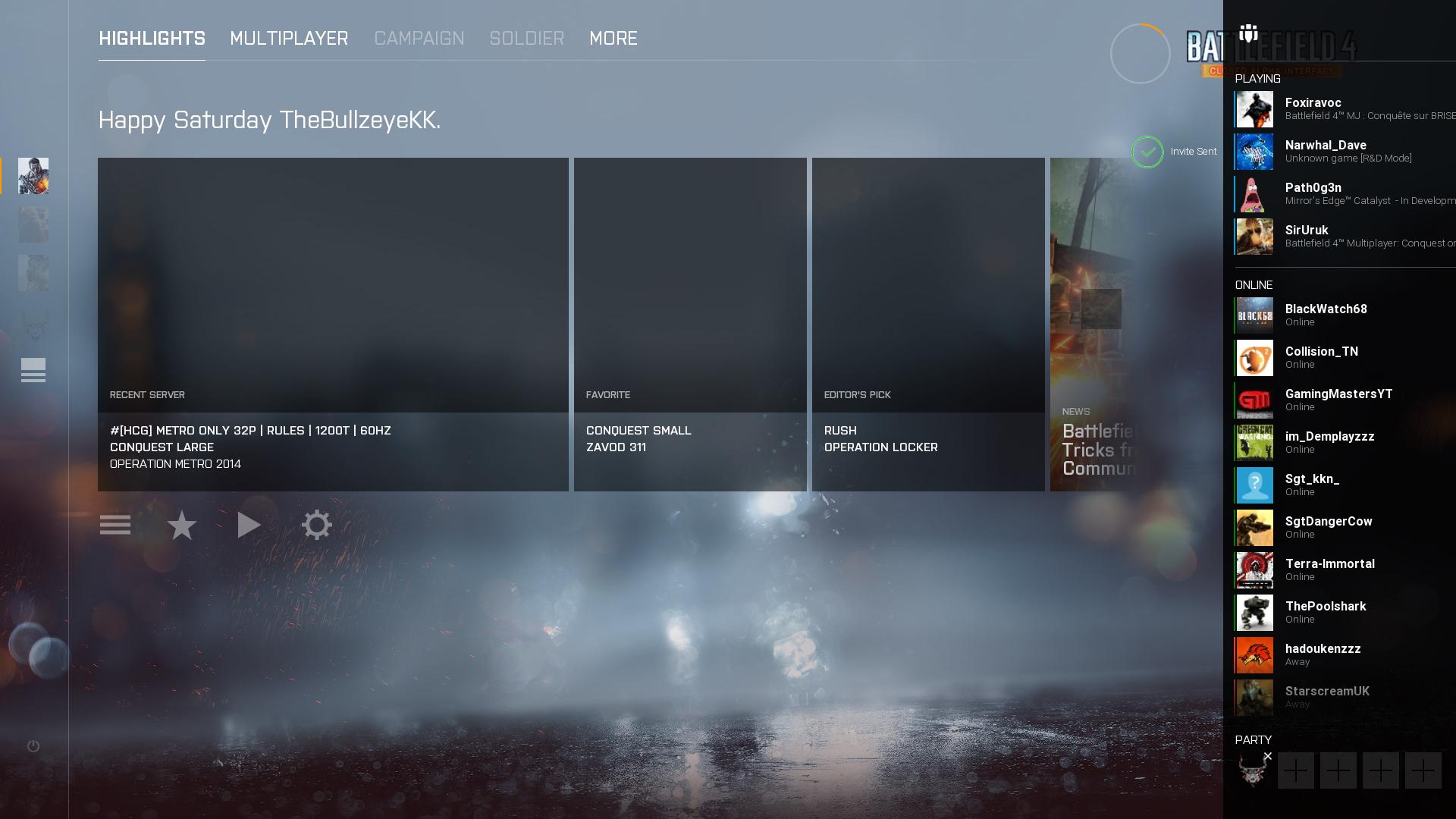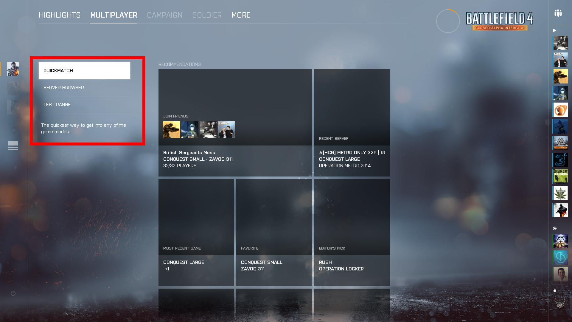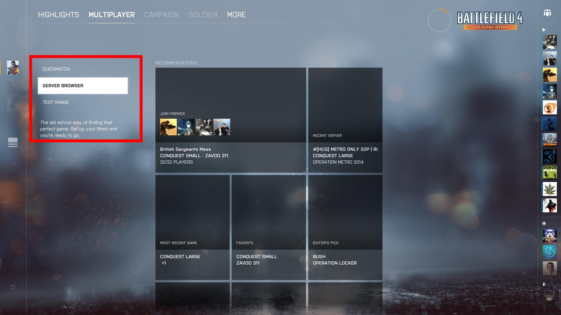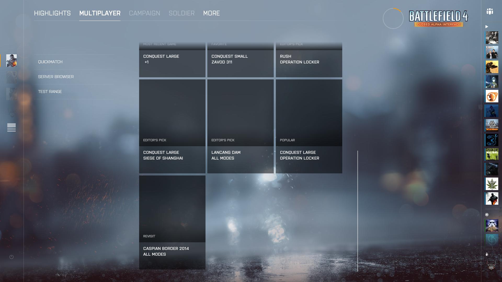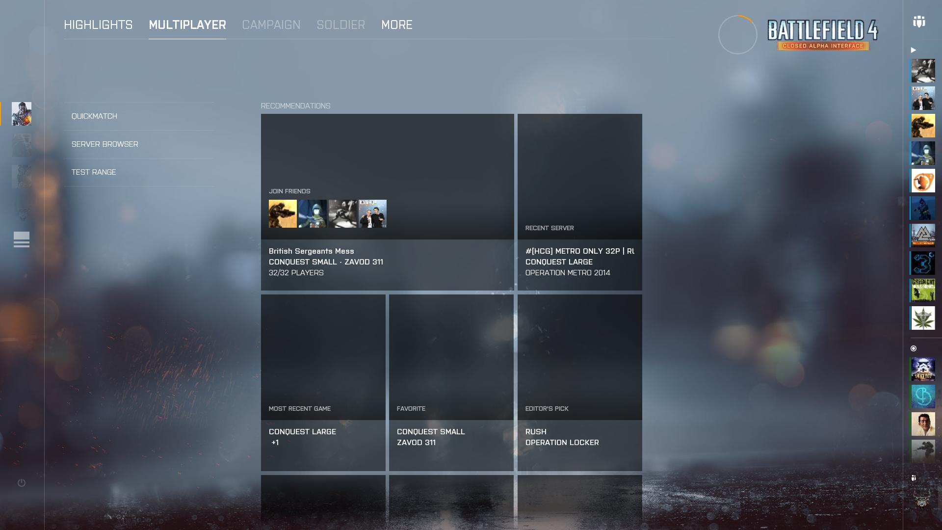 Bis auf ein Forum soll das Interface nachher genau so alle Inhalte wie im Battlelog anbieten. In der aktuellen Version des Battlefield User Interfaces hat man daher schon einen recht weiten Umfang und kann beispielsweise den neuen Serverbrowser nutzen und viele weitere Funktionen, wie das Quickmatch, die News, die Verwaltung der Freunde, Partys erstellen, ein Chat und natürlich die Spieloptionen, wie die Steuerung und Grafikoptionen anpassen.