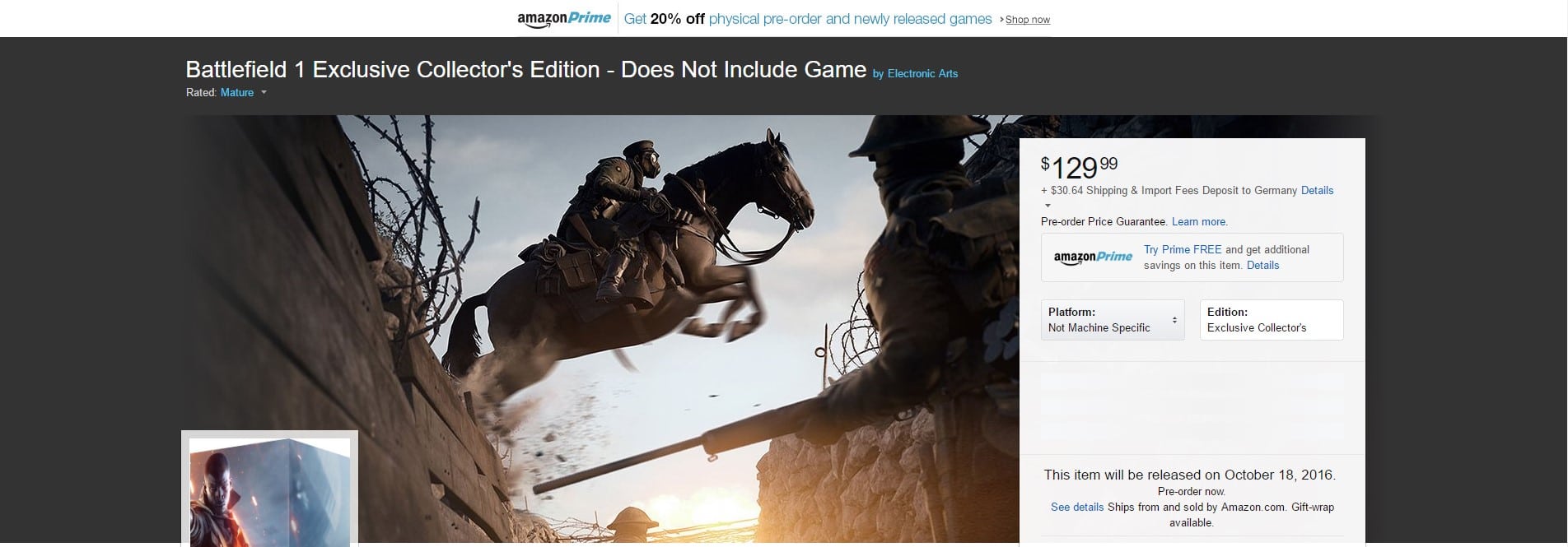 Um die Battlefield 1 Collector’s Edition, die hierzulande gekauft werden kann, soll es hier aber gar nicht gehen. Im Fokus der Community steht nämlich ein anderes Angebot. So kann auf dem amerikanischen Amazon Store eine Battlefield 1 Collector’s Edition gekauft werden, die ohne das Spiel an sich daher kommt. Der Preis liegt bei knackigen 129,99$. Die Sparfüchse unter euch werden sich nun vermutlich schon den Taschenrechner rausgeholt haben und den Dollar Umrechnungskurs studiert haben. Samt Exportgebühren und Versand kostet das Angebot knapp 145 Euro.