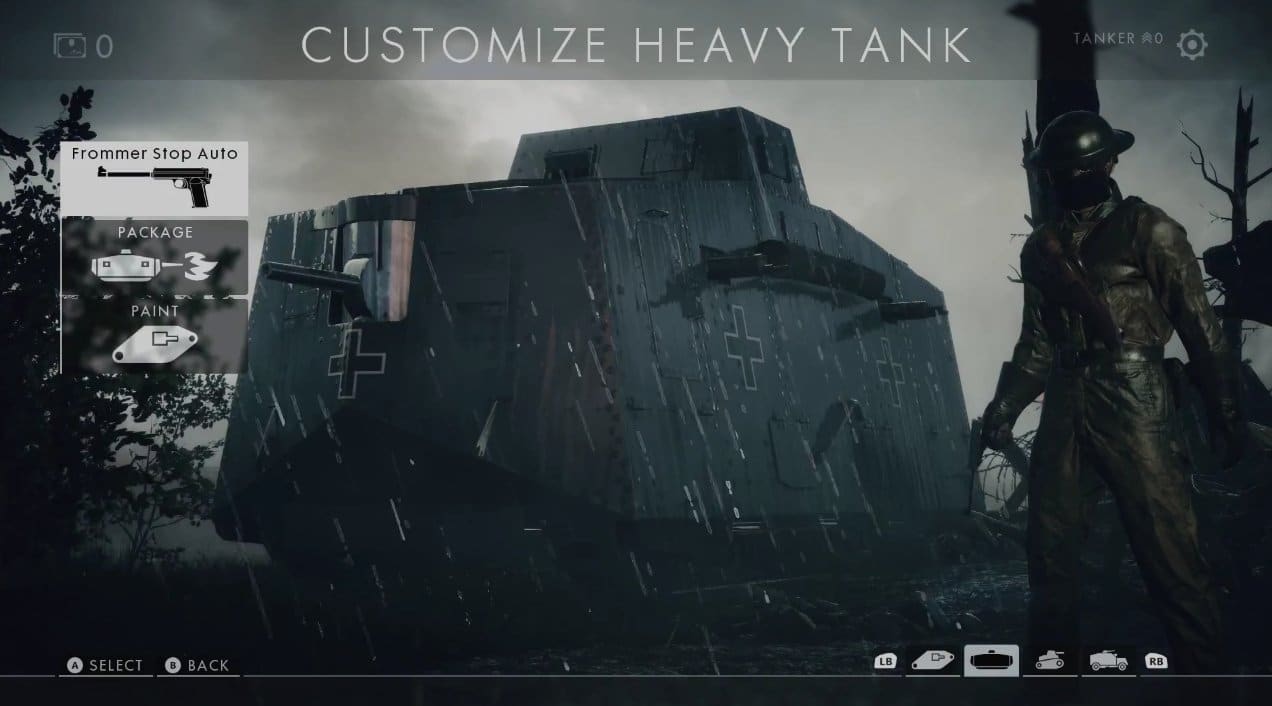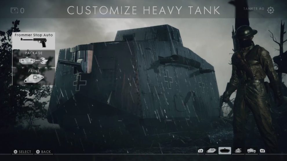 Nachdem wir die Closed Alpha gespielt haben, waren wir von dem Menü und den Anpassungsmöglichkeiten wenig überrascht. Es gab einfach nichts, was man hätte auswählen können. Für eine Alpha Version ist das aber auch nicht weiter tragisch. Das Menü, das DICE nun in Bruchteilen weniger Sekunden gezeigt hat, ohne auf die Anpassungsmöglichkeiten einzugehen, zeigt auf jeden Fall, was möglich sein wird. So kann der Panzerfahrer als auch der Pilot eine andere Waffe auswählen, die er nutzen möchte, sobald er aus dem Fahrzeug aussteigt, das Aussehen in Form eines Skins / Camos für das Fahrzeug auswählen und offensichtlich auch verschiedene Packages auswählen. Beim Heavy Tank sehen wir zum Beispiel einen Flammenwerfer, welchen es in der Closed Alpha nicht als Geschütz gab.
