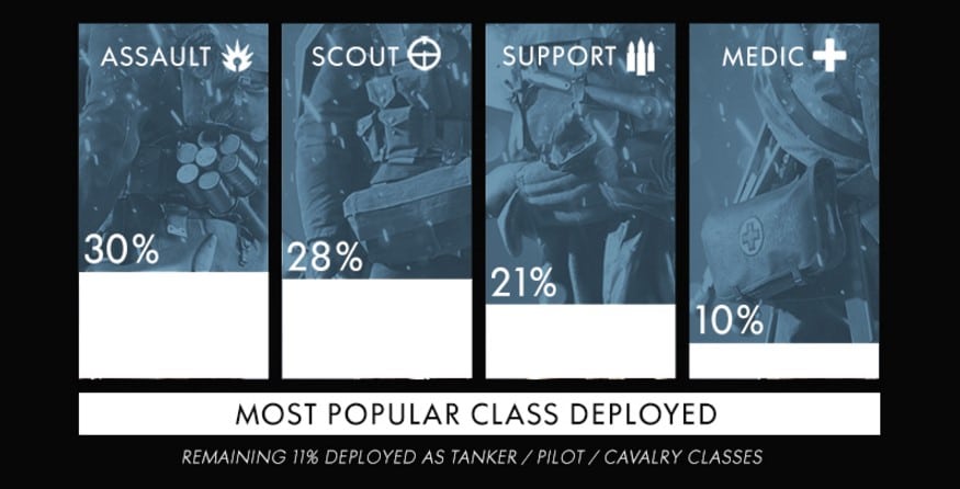 Während in Battlefield 3 und Battlefield 4 der Medic an erster Stelle war, teilen sich nun knapp der Assault und Scout Platz 1 der beliebtesten Klasse. Wir könnten uns nun hinstellen und ordentlich über Scharfschützen herziehen, lassen es aber an dieser Stelle, weil unter den 30% Scharfschützen sicherlich auch einer unserer Leser ist. Einen Appell müssen wir aber trotzdem loswerden: Wir brauchen mehr Medics! Spielt bitte mehr im Team und wählt auch mal diese sehr nützliche Klasse aus. 10% sind echt zu wenig.