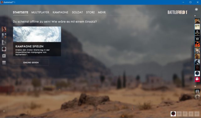 Wir haben uns natürlich direkt mal getraut unser Spiel zu starten und waren ebenfalls nicht in der Lage uns zu verbinden. Wir erhielten leider auch nur die Meldung “Du scheinst offline zu sein! Wie ware es mit einem Einsatz?” und den “Online gehen” Button. Im Offline Modus von Battlefield 1 lässt sich aber immerhin die Kampagne spielen.