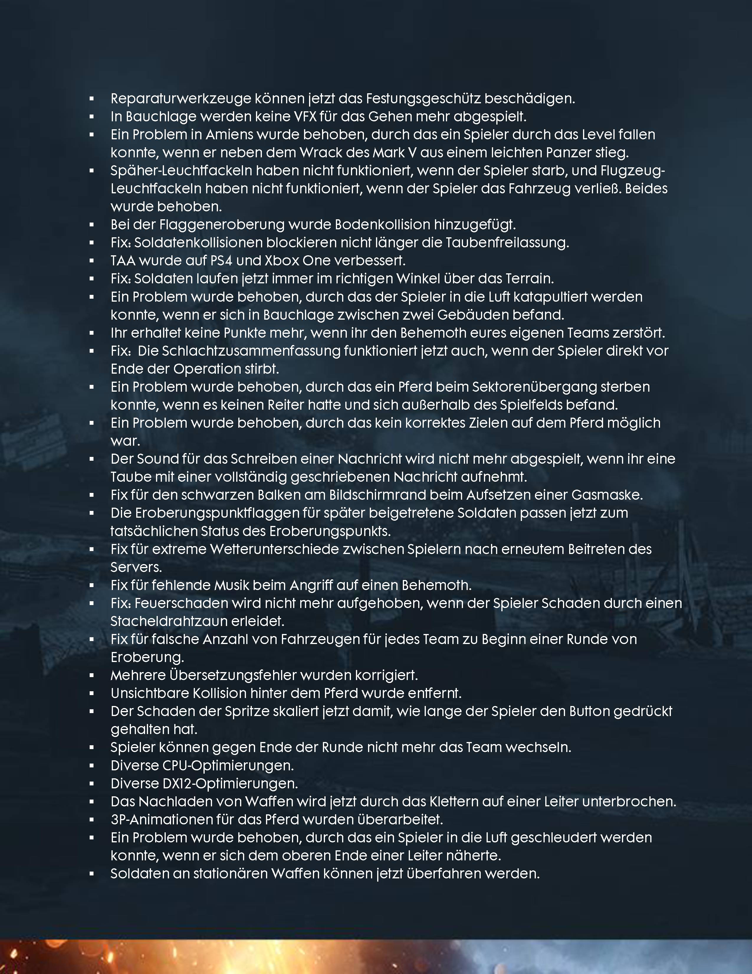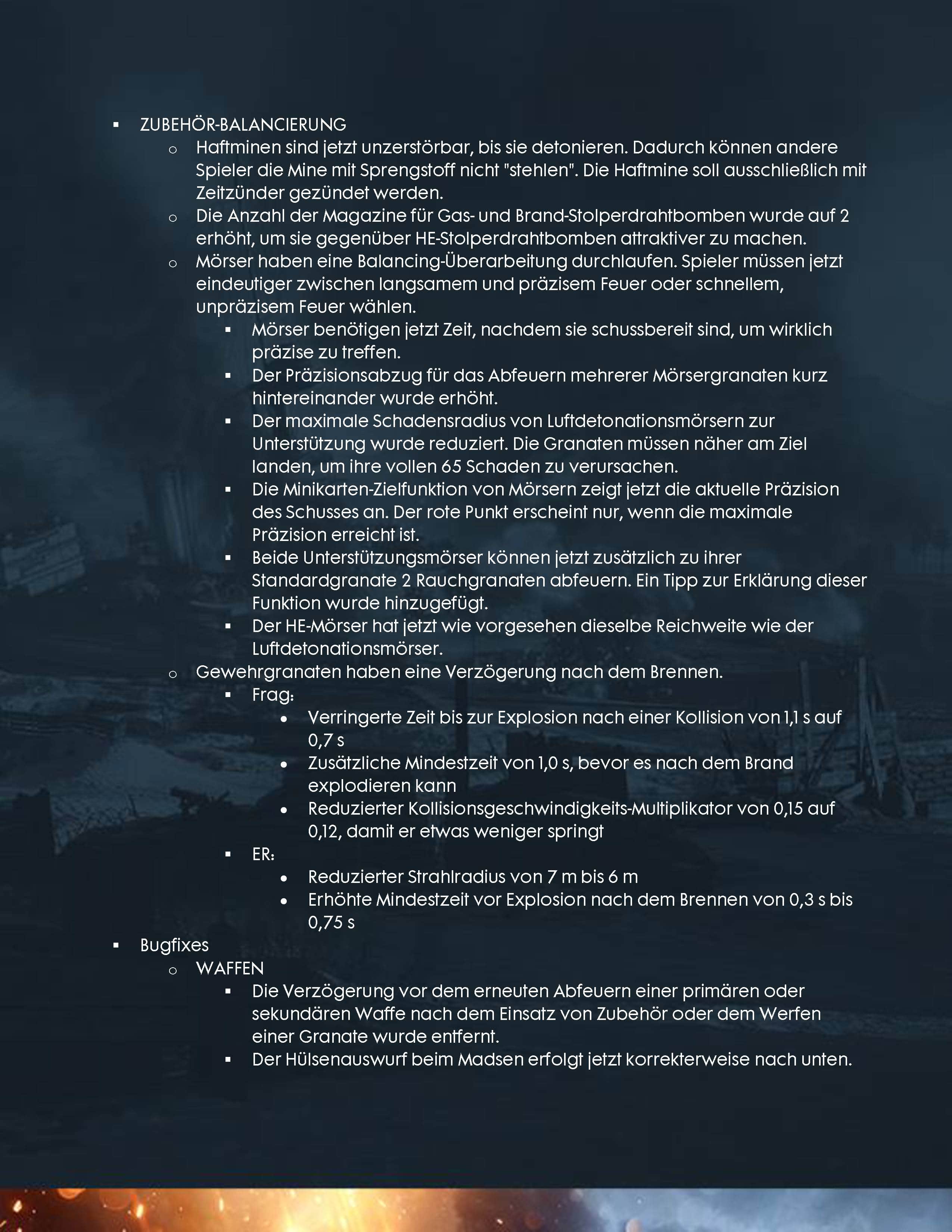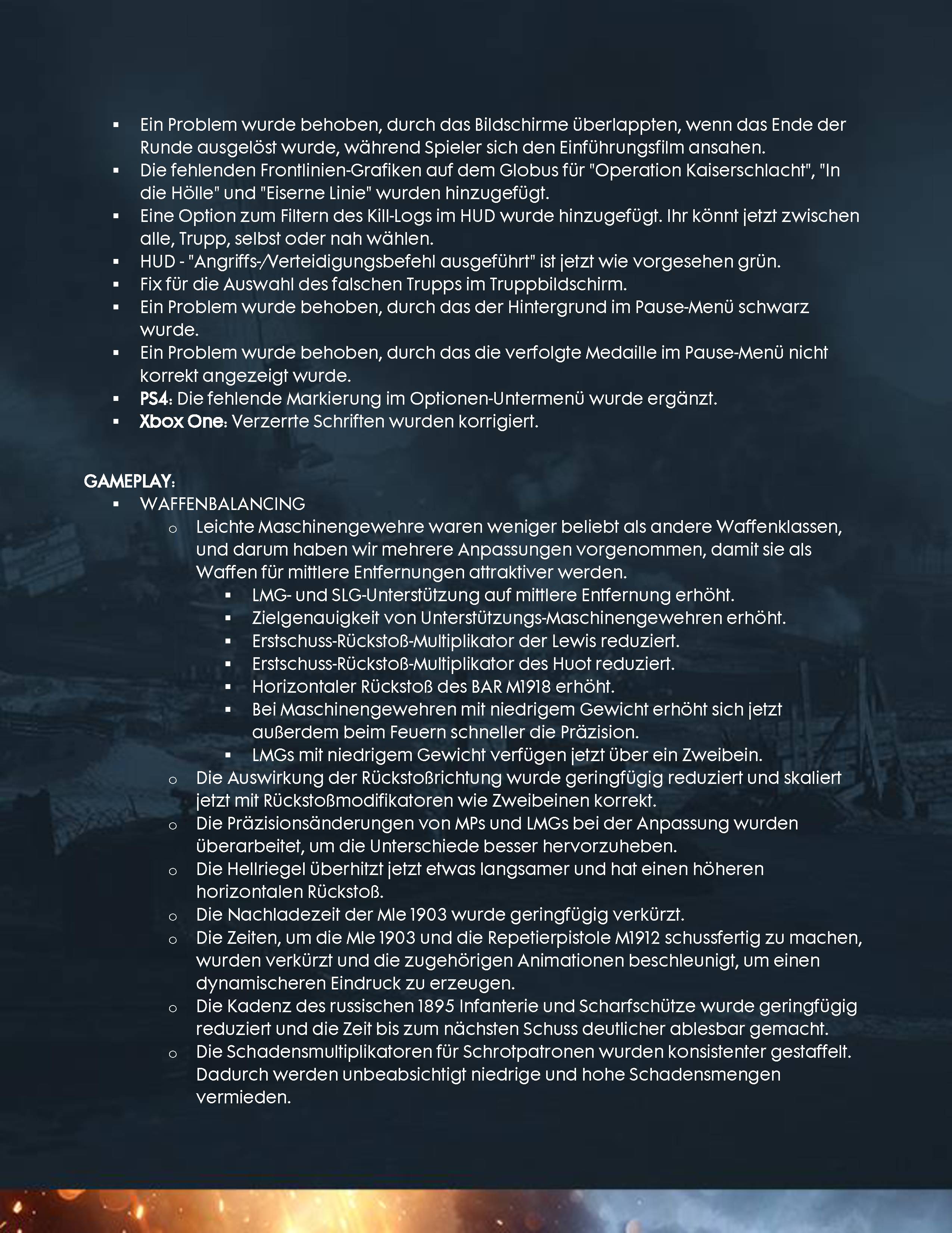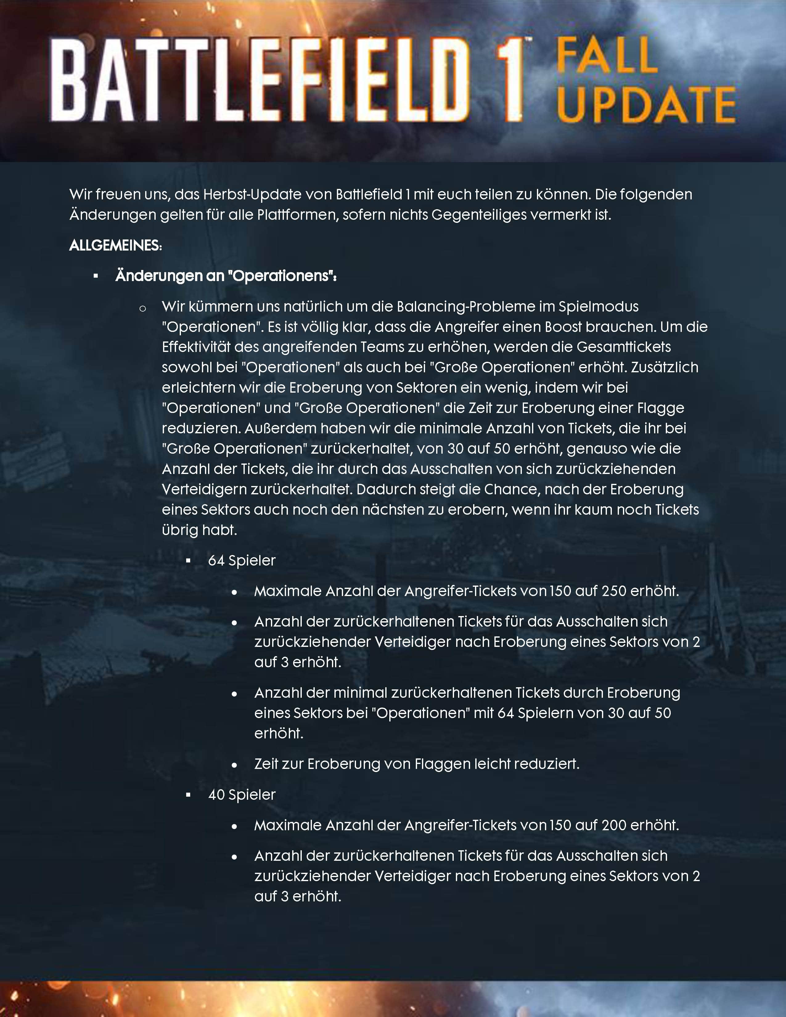 DICE hat alle Änderungen des Herbstupdates für Battlefield 1 in einem .pdf zusammengefasst, das 16 Seiten lang ist. Aus diesem Grund wollen wir an dieser Stelle auch nicht nochmal alles hier separat auflisten und verlinken euch der Einfachheit halber einfach die pdf. Datei.