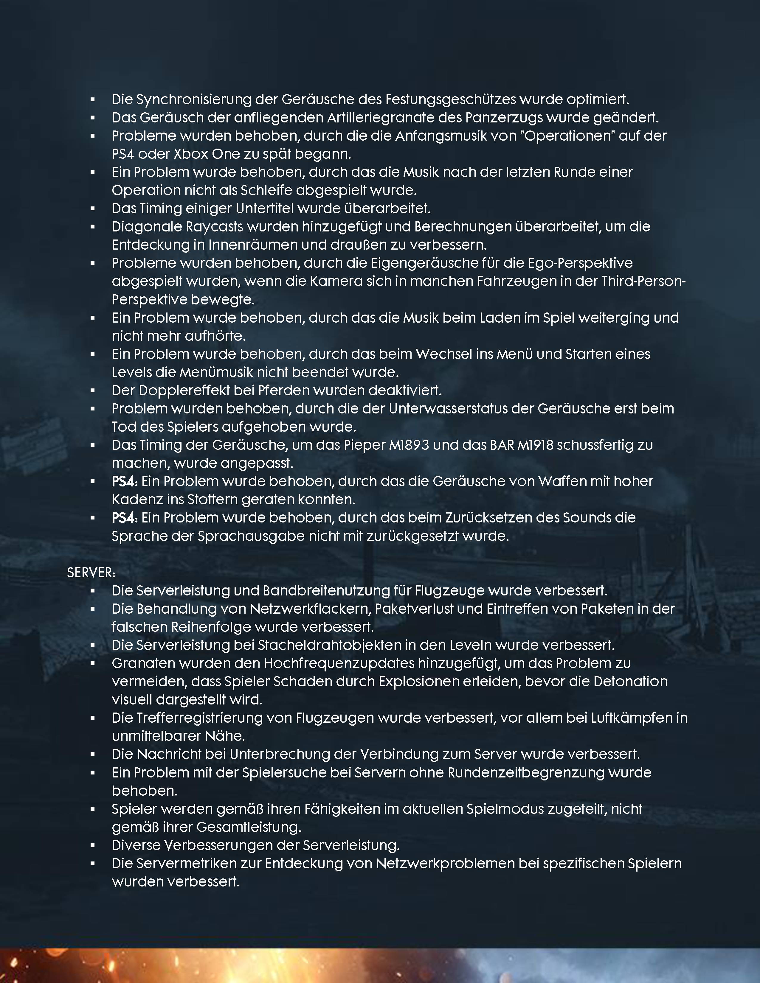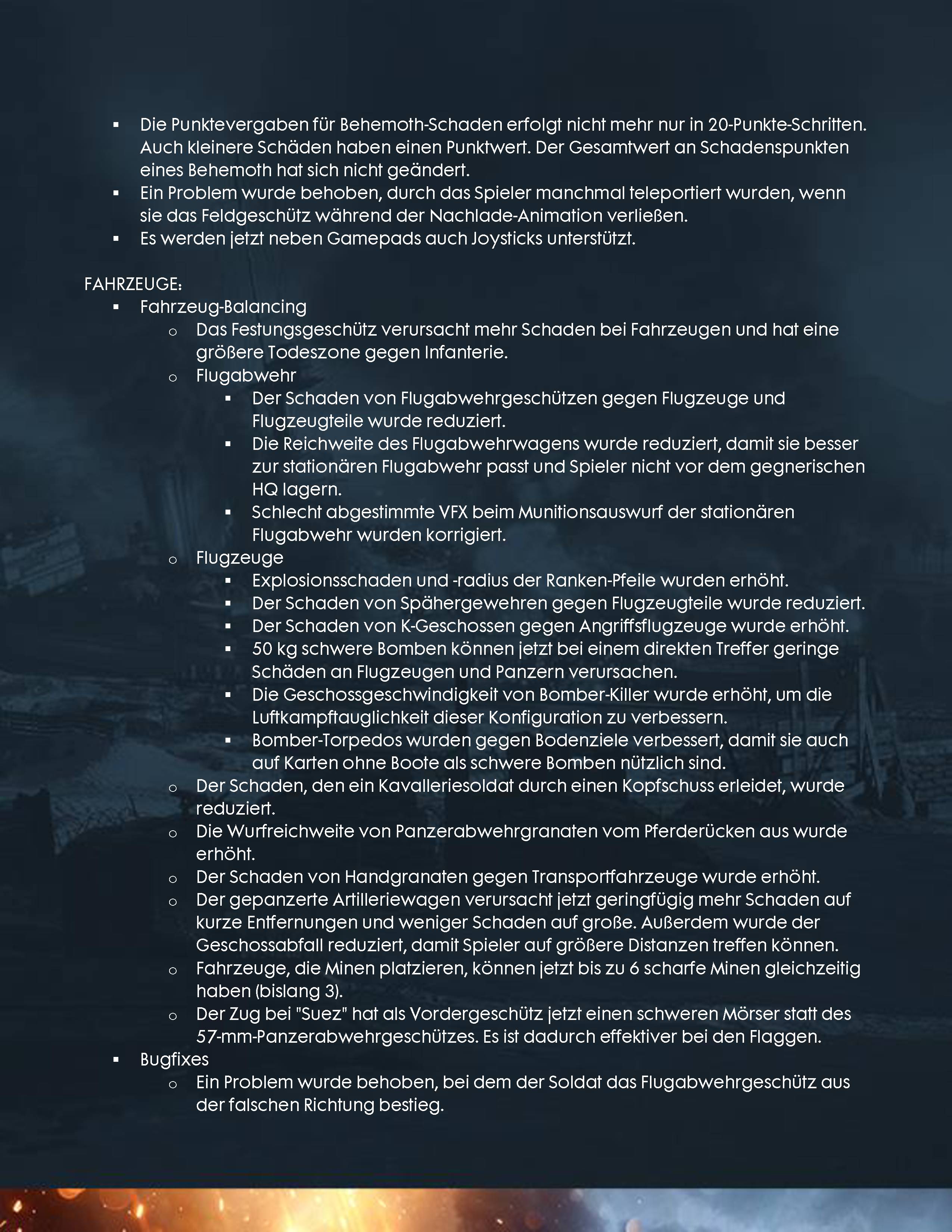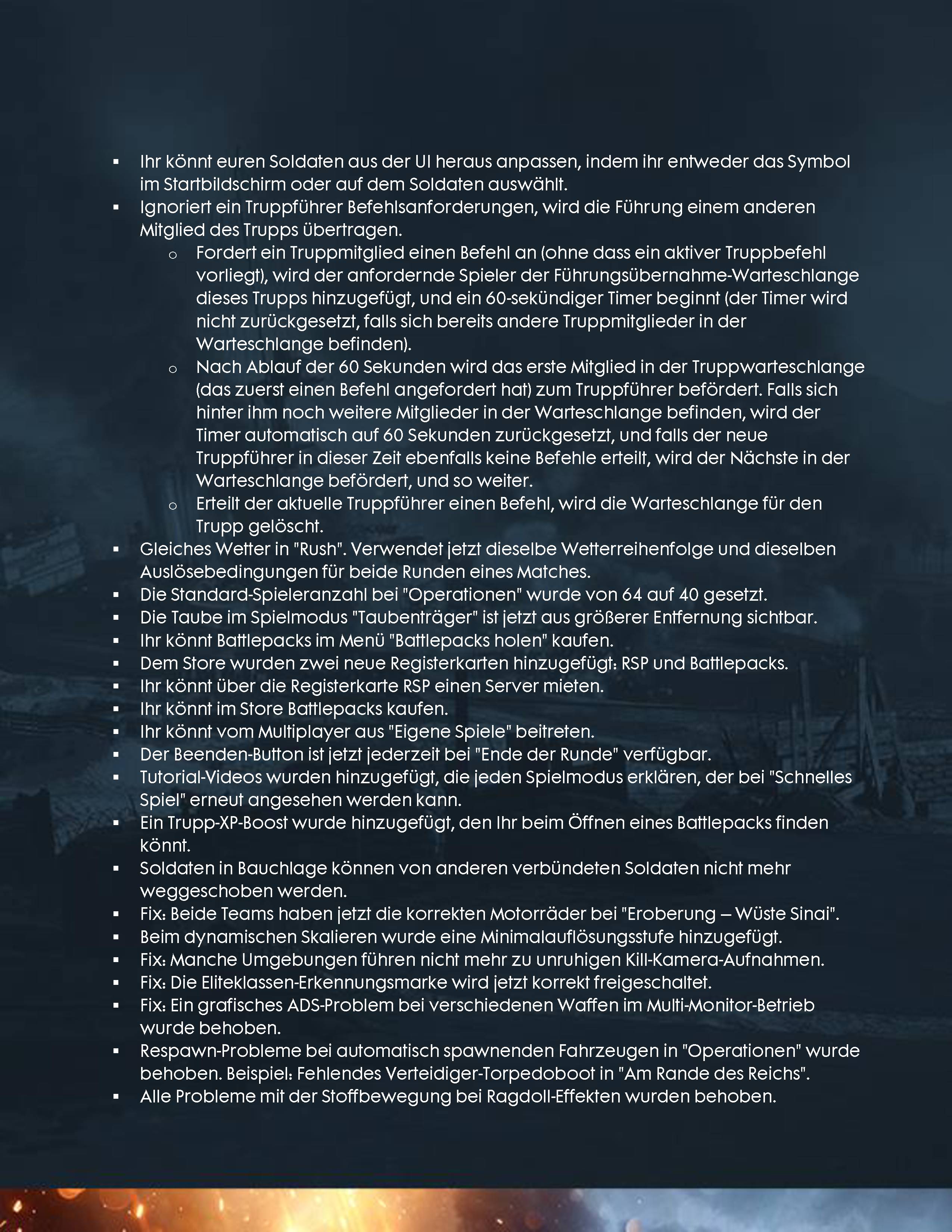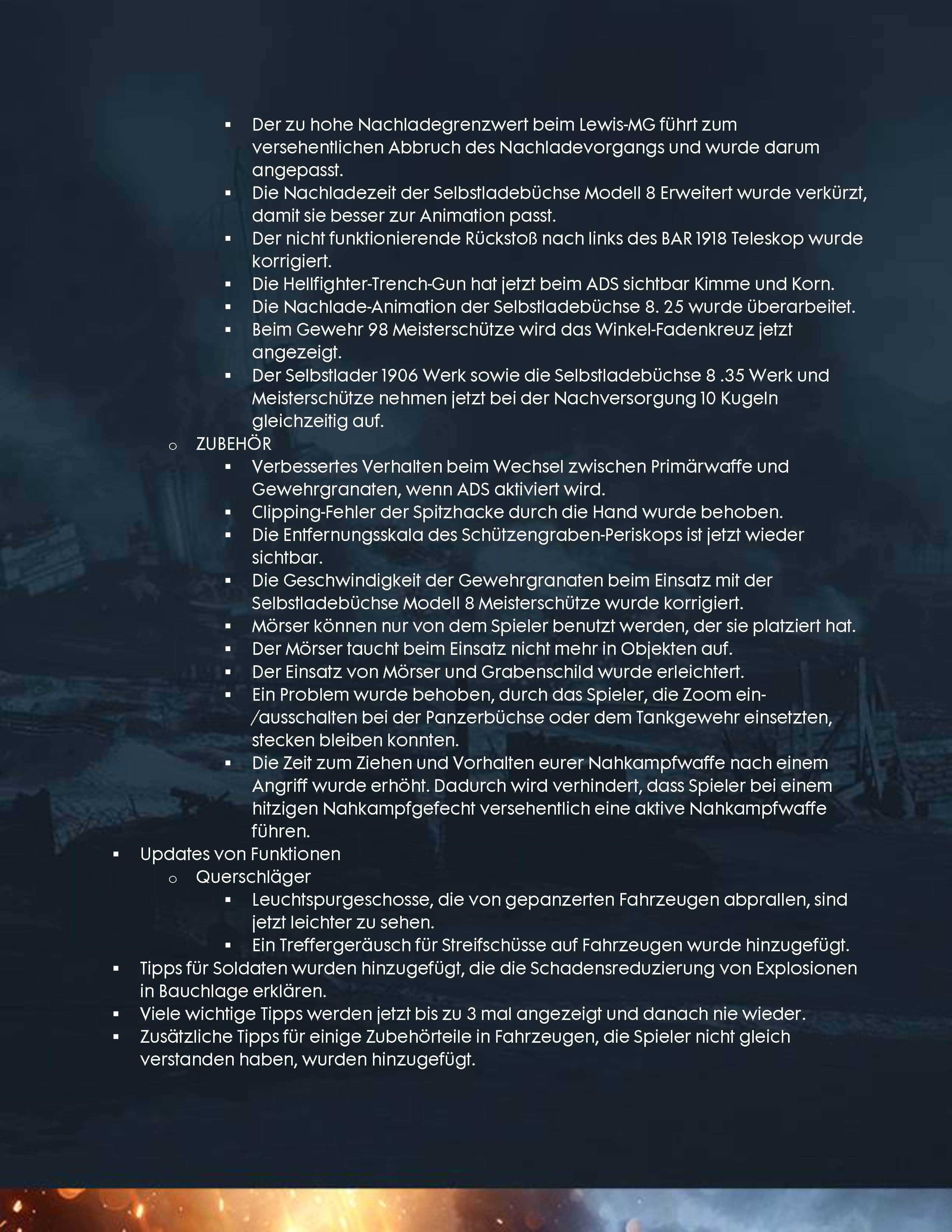 DICE hat alle Änderungen des Herbstupdates für Battlefield 1 in einem .pdf zusammengefasst, das 16 Seiten lang ist. Aus diesem Grund wollen wir an dieser Stelle auch nicht nochmal alles hier separat auflisten und verlinken euch der Einfachheit halber einfach die pdf. Datei.