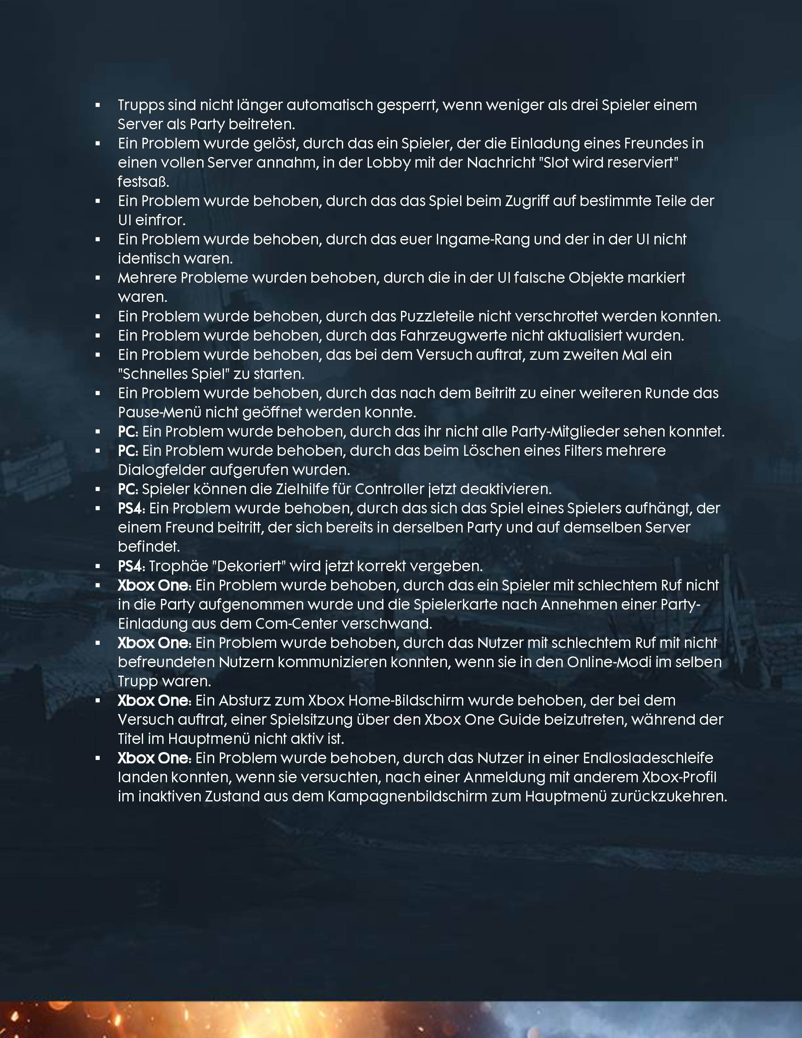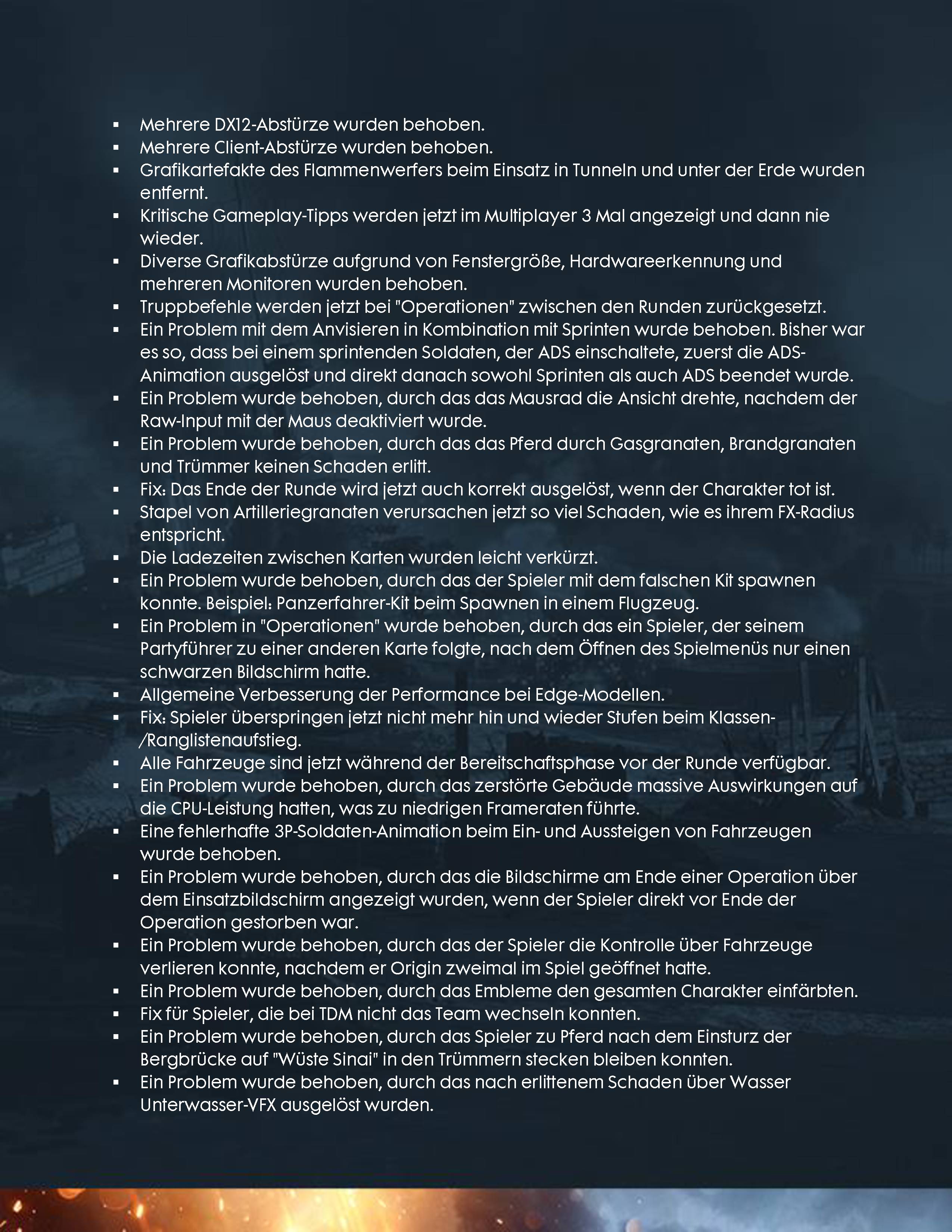 Dass der Patch groß ausfallen wird, wussten wir ja und DICE hat dieses oft genug erwähnt. Der Patch ist nun final auf allen Plattformen ausgerollt und bringt einige Verbesserungen und Änderungen mit sich. Auf dem PC ist das Update rund 1,6 GigaByte groß und auf den Konsolen müssen knapp 1,9 GigaByte heruntergeladen werden.