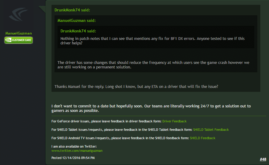 Vorwiegend Nvidia Spieler berichten derzeit über das Problem und sind im Nvidia Forum fündig geworden. Dort heißt es nämlich, dass die Entwickler von Nvidia quasi 24/7 an einer Lösung arbeiten und hoffentlich bald das Problem beheben.