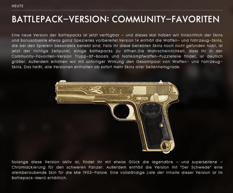 Eine neue Revision der Battlefield 1 Battlepacks ist da! Diesmal gibt es viel neues vom alten, aber dafür viel davon. Weiterhin gibt es natürlich Skins, doch die nun veröffentlichte Revision 14 der Battlefield 1 Battlepacks trägt den besonderen Namen “Community-Favoriten” und enthält Waffen sowie Fahrzeugskins, die bei den Spielern besonders beliebt sind.