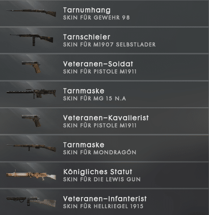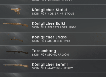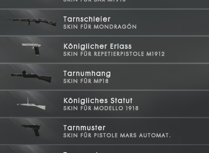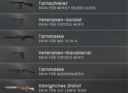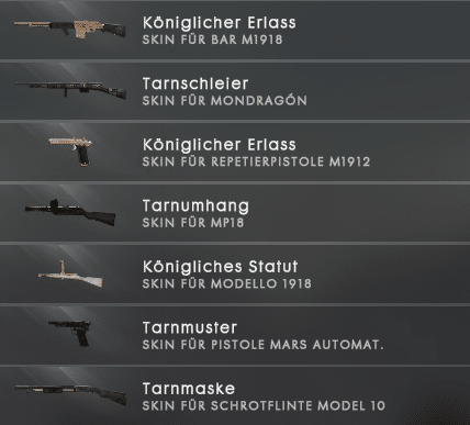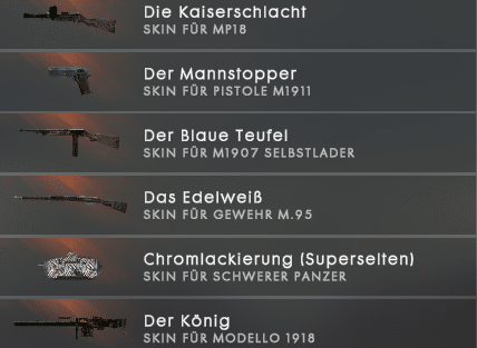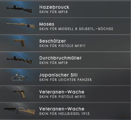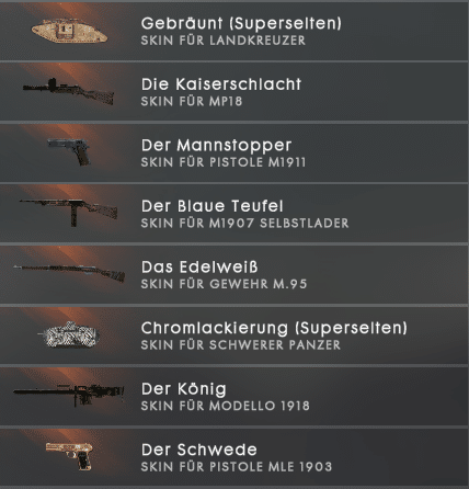 Damit es aber nicht zu langweilig wird und nur altes freigespielt werden kann, gibt es eine neue super seltene Chromelackierung für den schweren Panzer und einen tollen Skin für die MIe 1903-Pistole.