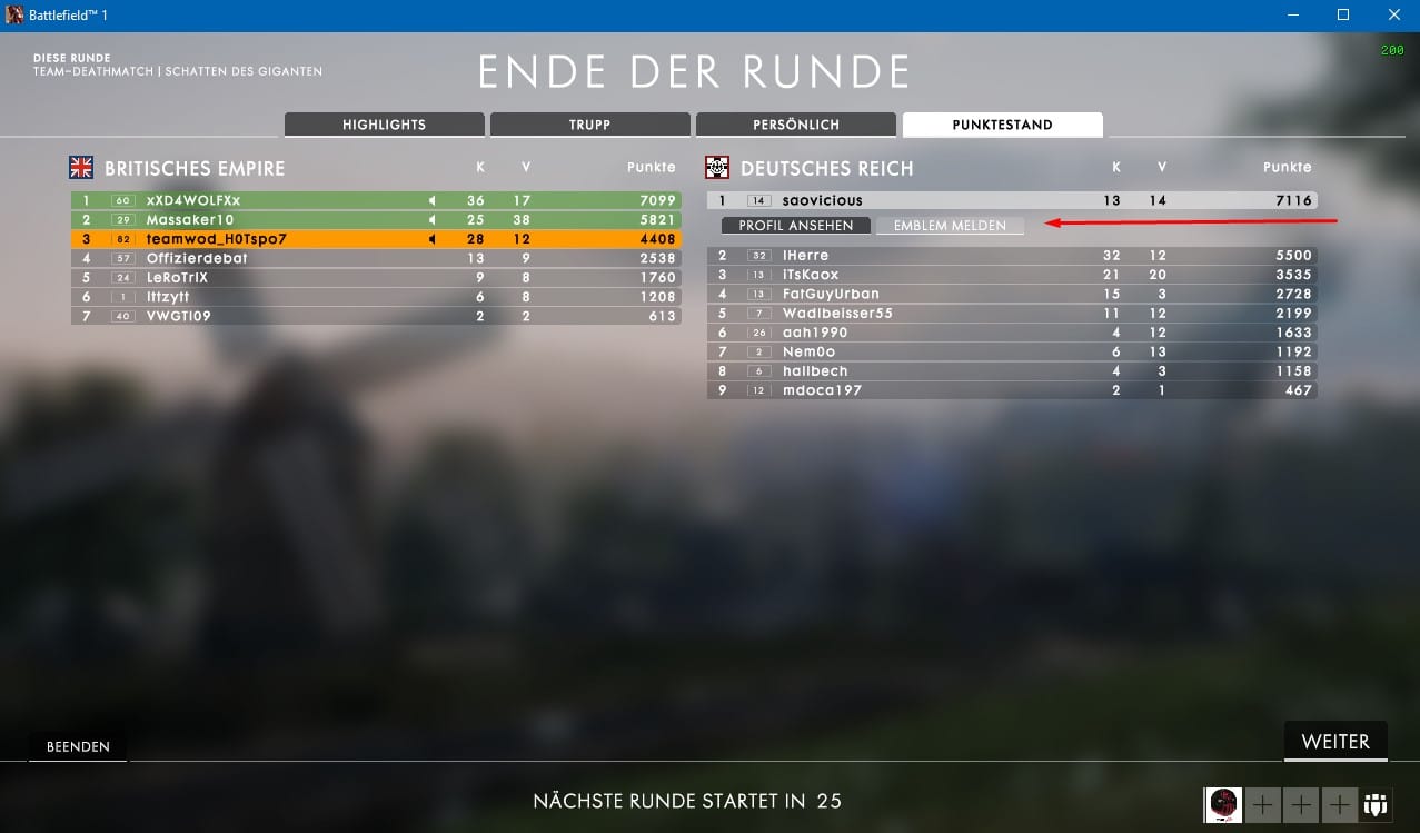 Spieler -/ Emblem melden in Battlefield 1