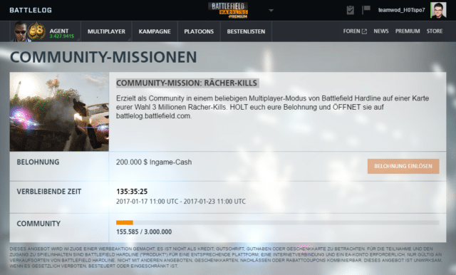 Da ihr nach Erreichen der 3 Millionen Rächer-Kills das Ingame-Cash nicht automatisch erhaltet, denkt bitte daran, dass ihr eure Belohnung im Battlelog unter dem Reiter Multiplayer „Community Missionen“ abholen müsst!
