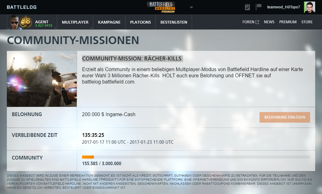Neben der Tatsache, dass DICE für Battlefield 4 eine Community Mission gestartet hat, hat auch Visceral Games für Battlefield Hardline eine Community Mission gestartet. Solltet ihr zu den leider nur noch wenigen Battlefield Hardline Spielern gehören, müsst ihr als Community in einem beliebigen Multiplayer-Spielmodus sowie auf einer beliebigen Karte eurer Wahl 3 Millionen Rächer-Kills erzielen. Als Belohnung winken euch 200.000$ Ingame-Cash.
