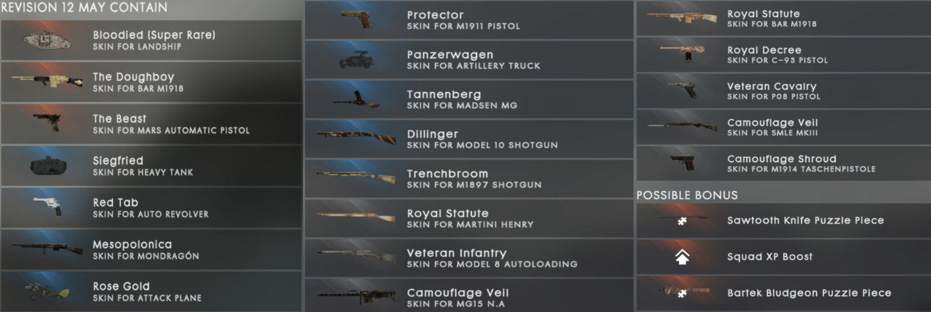 DICE hat heute die zwölfte Revision der Battlefield 1 Battlepacks veröffentlicht. Die neue Revision enthält wie gehabt neue Skins für Waffen und Fahrzeuge, sprich für Panzer und Flugzeuge. Insgesamt gibt es diesmal 20 neue Skins und die üblichen drei Bonusitems. Von diesen 22 Skins sind diesmal 8 gewöhnlich, 9 höherwertig und 3 legendär.