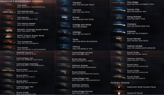 Wir sind wieder eine Woche älter und DICE hat die nächste Battlefield 1 Battlepack Revision veröffentlicht. Auch, wenn diese Revision im Zeichen von “Make Love, not War” stehen sollte, vermissen wir die obligatorischen Valentinstags-Skins mit Herzen oder irgendwas einfallsreichem. Ja liebe Männer, das Konsumfest ist schon nächste Woche. Wie auch immer, nachfolgend findet ihr die Zusammenfassung und Bilder zu den Skins aus Battlepack Revision 16 bzw. der “Valentines Day” Edition.