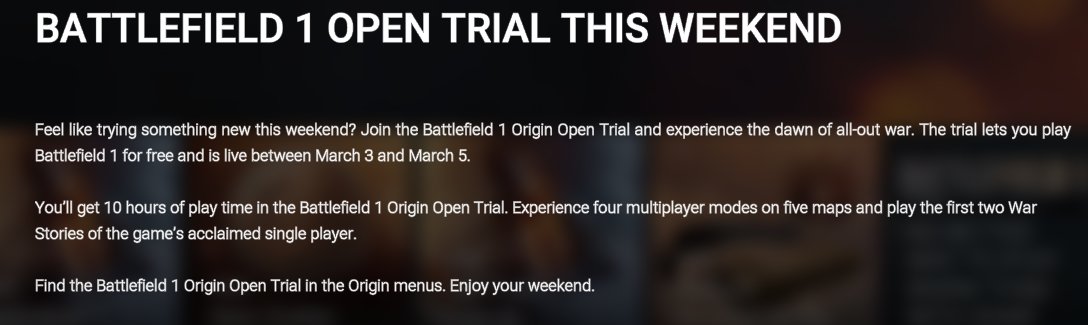 Wer sich bisher noch nicht entscheiden konnte Battlefield 1 zu kaufen oder während der Beta nicht die Zeit hatte Battlefield 1 zu testen, der hat am kommenden Wochenende die Möglichkeit auf dem PC sowie der Xbox One Battlefield 1 für einen limitierten Zeitraum und vollkommen umsonst zu spielen.