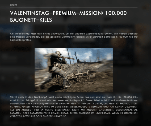 DICE hat eine spezielle “Battlefield 1 Valentine’s Mission” für Spieler mit dem Battlefield 1 Premium Pass gestartet. Im Rahmen dieser Mission muss es euch als Premium Community, sprich allen Spielern mit Battlefield 1 Premium Pass, gelingen 100.000 erfolgreiche Bajonettangriffe zu erzielen. Sollte das Ziel am Ende der Mission erreicht sein, erwartet die Premium Community als Belohnung ein verbessertes Battlepack.