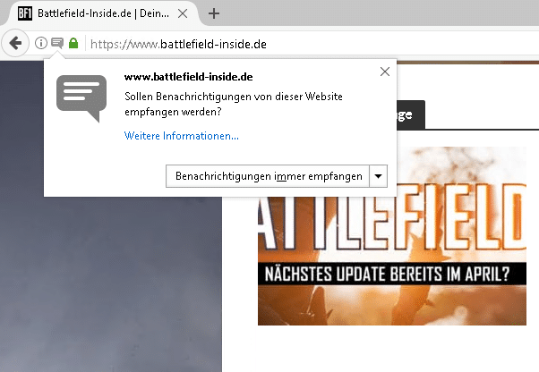 Die Abfrage erscheint automatisch beim Laden der Seite oben links im Browser Fenster und benötigt ebenfalls keine persönlichen Daten von euch. Natürlich ist diese Benachrichtigungsfunktion sowie unsere Beiträge, der wöchentliche Battlefield Report und alles andere auf unserer Webseite gratis.