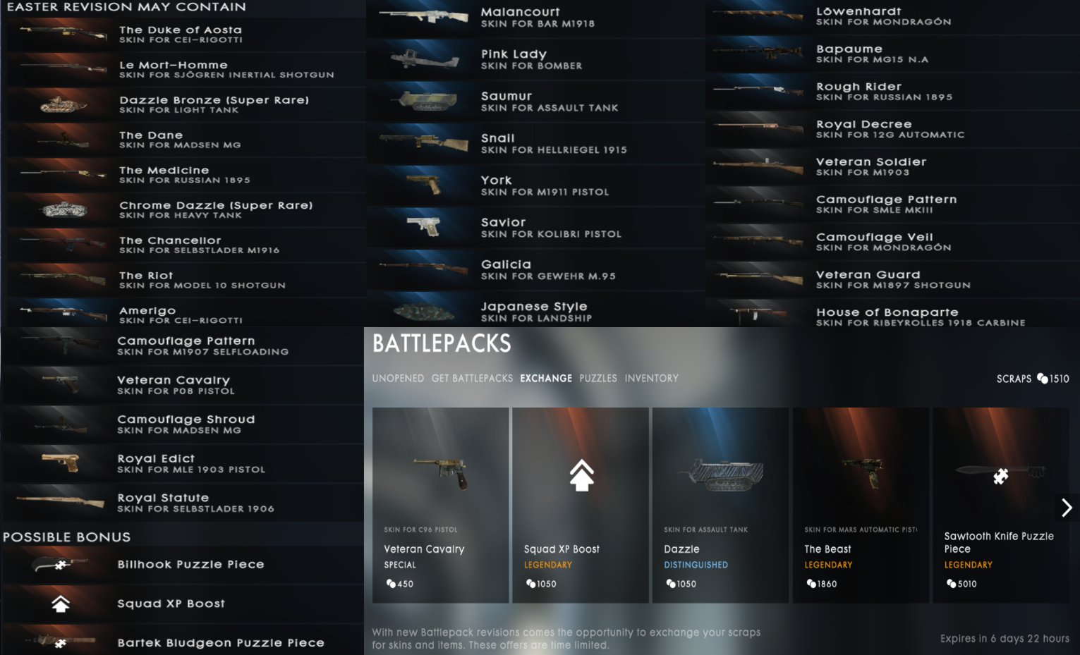 Welche Skins und welche Austauschitems es in der Oster Revison der Battlefield 1 Battlepacks gibt, seht ihr auf dem nachfolgenden Bild.