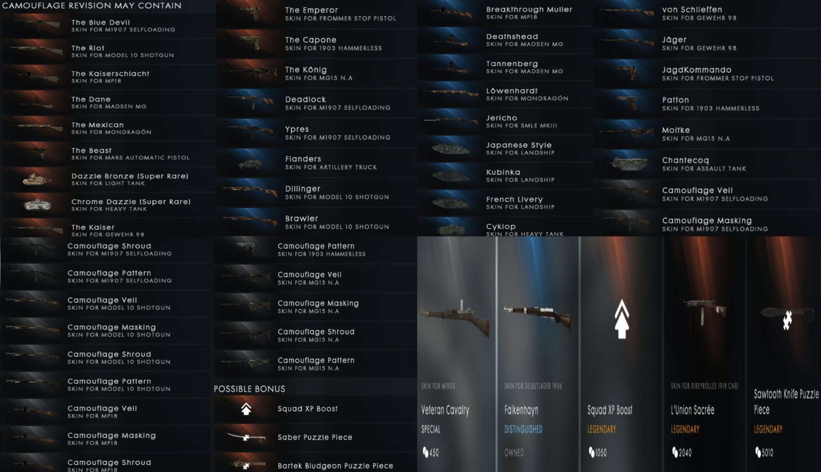 Heute an Christi Himmelfahrt, der übrigens auch in Schweden ein Feiertag ist, hat DICE die nächste Battelefield 1 Battlepack Revision veröffentlicht. Unter dem Motto “Camouflage” hat DICE in der Revision 33 der Battlefield 1 Battlepacks insgesamt 48 Skins zum Freischalten versteckt. Von diesen 48 Skins sind 16 gewöhnlich, 20 höherwertig und 12 legendär. 8 der insgesamt 48 Skins sind Fahrzeugskins. Unter anderem gibt es wieder den Chrome *Bling Bling* Skin für den Heavy Tank und den Bronze Skin für den Light Tank.