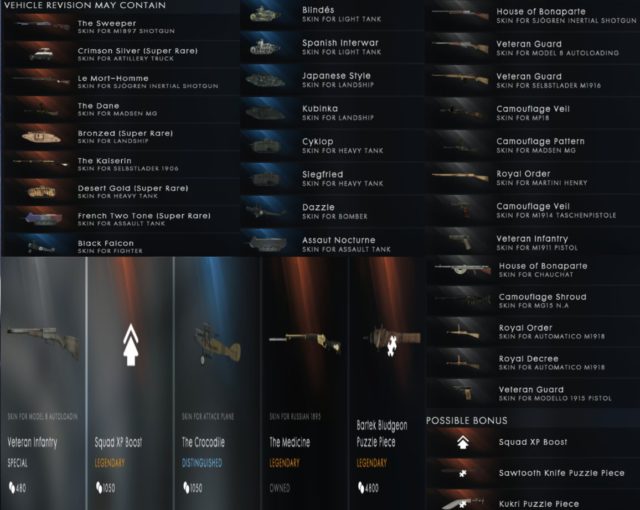 Seit gestern gibt es wieder neue Inhalte für die Battlefield 1 Battlepacks. Während Revision 31 überwiegend unspektakulär war, gibt es in Revision 32 nun dutzende Fahrzeugskins und die fallen im Gegensatz du Waffenskins auf und haben je nach Map und Skin auch einen Mehrwert durch den Tarneffekt. Die 32. Revision der Battlefield 1 Battlepacks beinhaltet insgesamt 30 Skins und drei Bonusitems. Von diesen 30 Skins sind 22 gewöhnlich, 10 höherwertig und 8 legendär. 14 der insgesamt 48 Skins sind Fahrzeugskins.