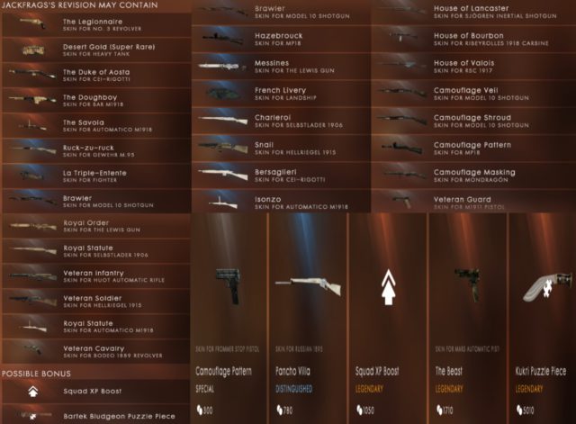 Im Rahmen der Battlefield 1 JackFrags Battlepack Revision habt die Möglichkeit 30 neue Skins freizuschalten. Fünf der Skins sind legendär, 11 höherwertig und auf 14 gewöhnliche Skins habt ihr regelmäßige Drop-Chancen. Bei 3 der insgesamt 30 Skins handelt es sich um Fahrzeugskins. Als Bonusitems erhaltet ihr in der JackFrags Revision neben dem Trupp-XP-Boost die Möglichkeit auf ein Puzzleteil für den Bartek Knüppel.