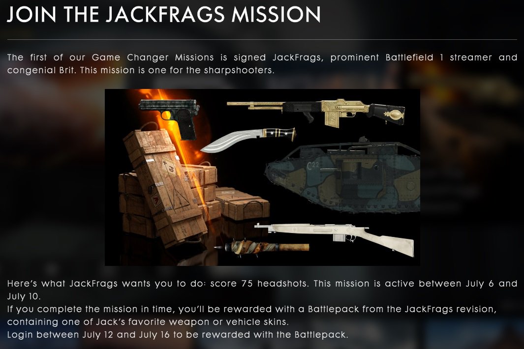 Im Rahmen der Battlefield 1 JackFrags Community Mission habt ihr die Aufgabe 75 Headshot Kills mit einer beliebigen Waffe zu erzielen. Als Belohnung erhaltet ihr ein JackFrags Battlepack.