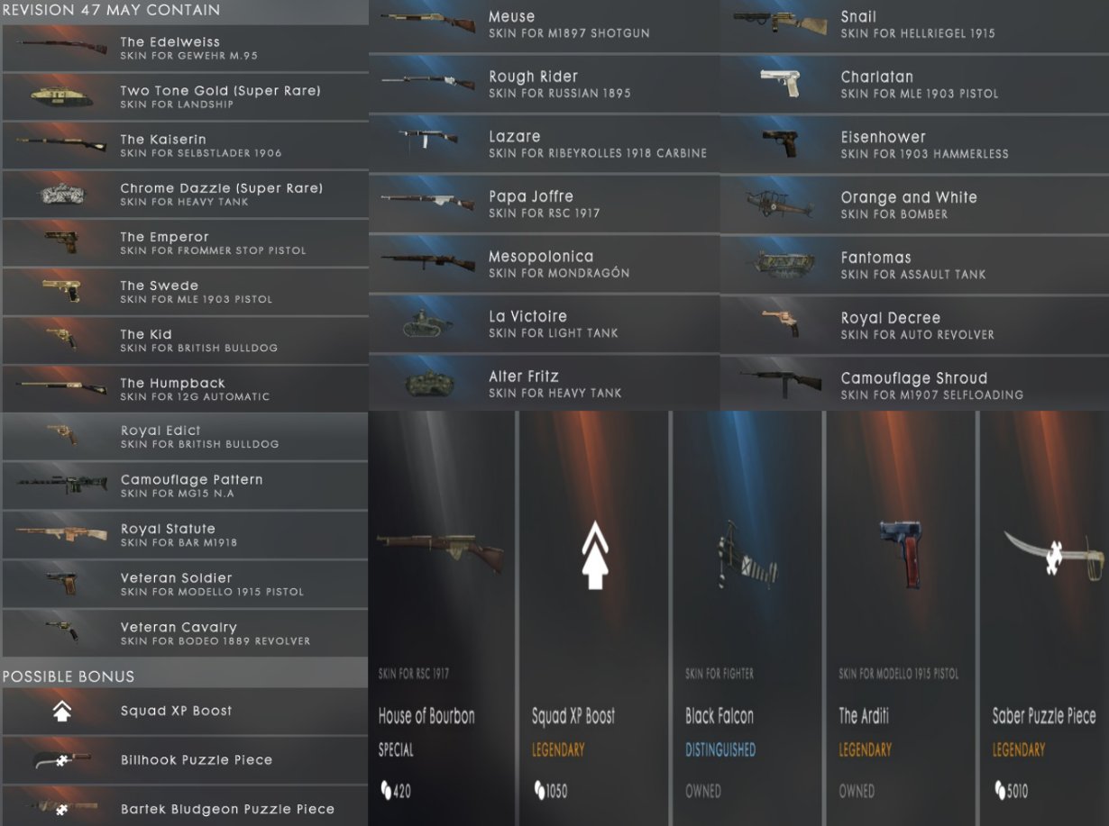 Die heute veröffentlichte Revision 47 der Battlefield 1 Battlepacks beinhaltet 27 Skins sowie drei Bonusitems. Von den 27 Skins sind 7 gewöhnlich, 12 höherwertig und 8 legendär. Sechs der diesmal 27 Skins sind Fahrzeugskins.