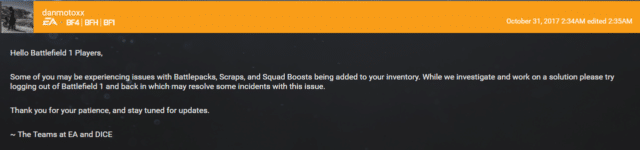 Die Ursache dafür ist aber nicht etwa ein schlechter Kurs am Aktienmarkt, sondern ein Fehler in Battlefield 1, der ebenfalls Battlepacks und Squad Boosts verschwinden lässt oder gar nicht erst gutschreibt. Von DICE gab es dazu bisher kein Feedback. Erst heute hat sich der Global Community Manager “Dan Mitre” im offiziellen Battlefield 1 Forum zu diesem Problem geäußert.