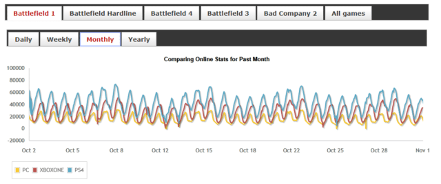 Im Monatstrend zeigen unsere Battlefield Statistiken eindeutig, dass man eine Konstante Spielerschaft hat, die in etwa auf allen drei Plattformen gleich bleibt. Auf den Konsolen sind eindeutig die meisten Spieler unterwegs. Auf der Playstation 4 sind es im Durchschnitt knapp über 60.000 Spieler täglich. Die Xbox One folgt mit knapp 42.000 Spielern und der PC mit 25.000 Spielern.